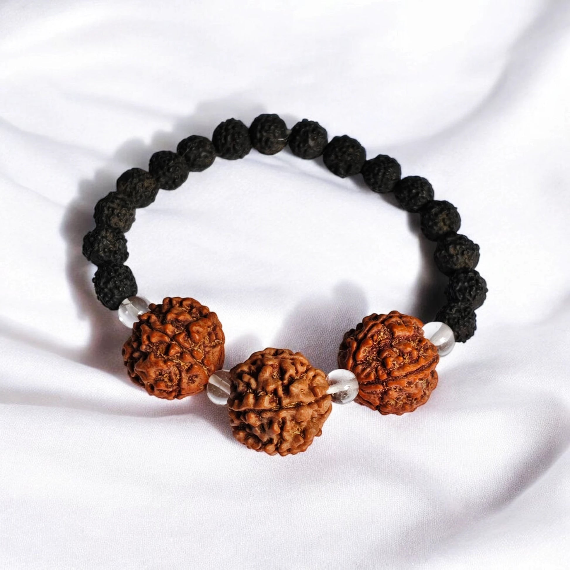 This beautifully crafted bracelet features a powerful 6 Mukhi Rudraksha in the center, supported by 5 Mukhi Rudraksha beads on both sides. It is designed to bring strength, balance, and spiritual protection.