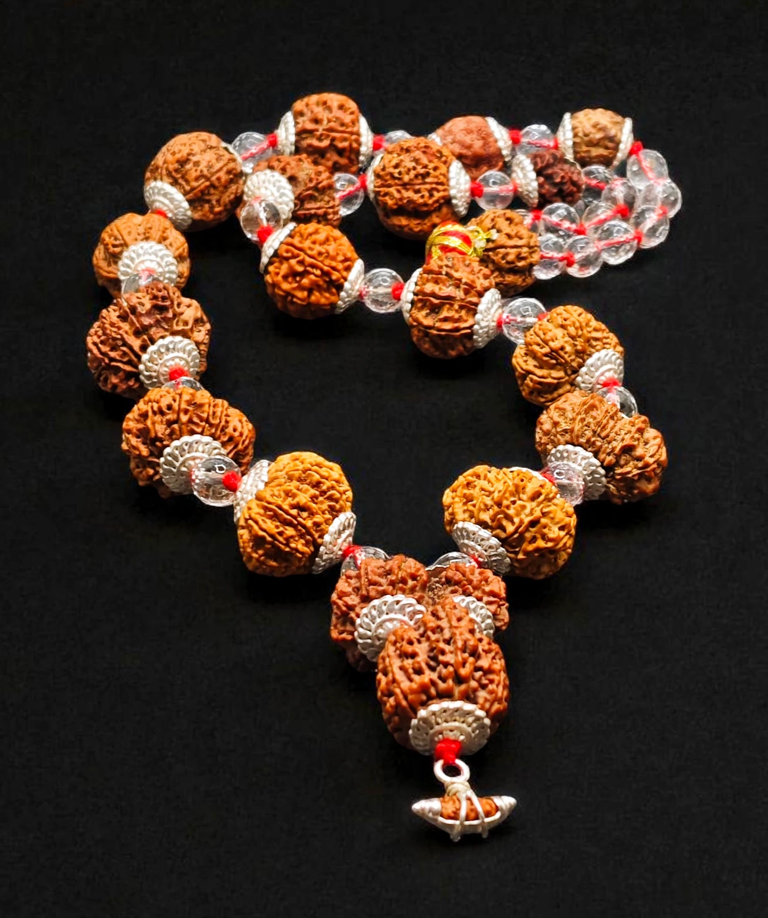 Each bead is beautifully capped in silver and interspaced with clear Sphatik (crystal) beads to enhance purity, positivity, and divine vibrations. This Siddh Mala is believed to align all chakras, remove obstacles, attract prosperity, and deepen meditation practices.