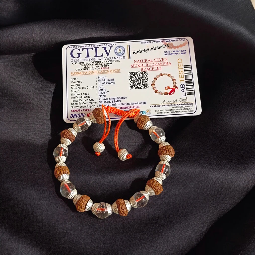 This Beautiful Bracelet is designed with premium-quality Indonesian 7 Mukhi Rudraksha beads, Sphatik and pure silver .It's free size Bracelet.